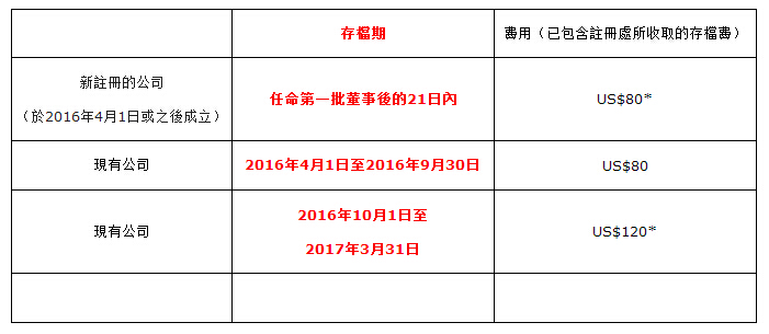 1. 2016年4月1日起,BVI新設(shè)費(fèi)用。在現(xiàn)有的費(fèi)用上增加一個董事名冊注冊處備案費(fèi):USD80。